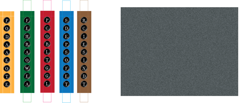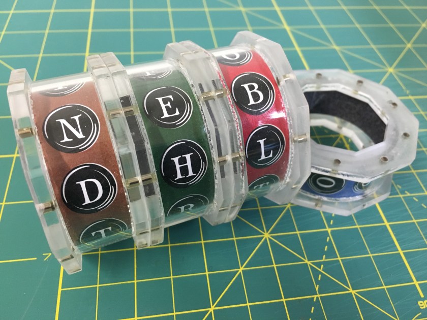 A few years back, on the heels of the release of The Imitation Game , MoMath hosted a puzzle hunt based on that film. To that end, the exhibit designer and I were tasked to create a codex cylinder for one of the problems the participants were to solve. He created this lovely acrylic and magnet device and my job was to make the letters to be manipulated to break the code. Seeing that the hunt was based on the movie, and the movie was based on Alan Turing’s quest to break the German ENIGMA code during World War 2, I used the ENIGMA code machine as an inspiration – using typewriter-style lettering for the letters, and including a patterned interior based on the housing of the ENIGMA machine itself. These devices are still used by the Museum education department as part of their code-breaking lessons.